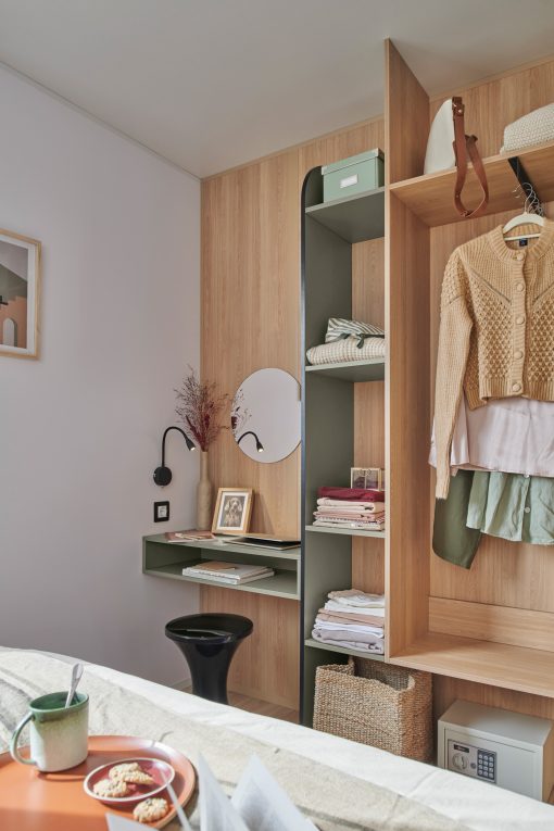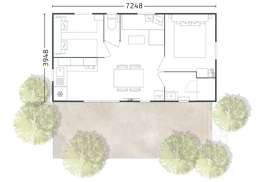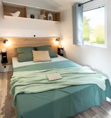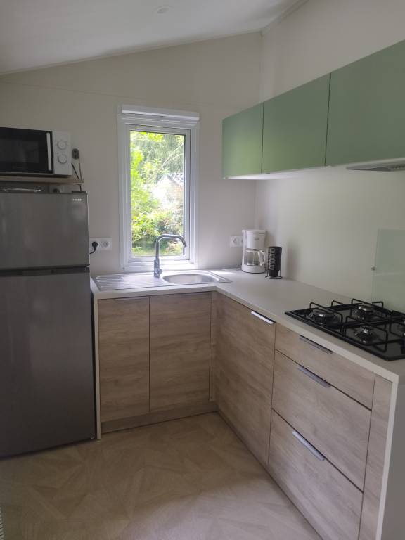 Ce charmant mobil-home avec terrasse couverte possède 3 chambres séparées et une cuisine aménagée.