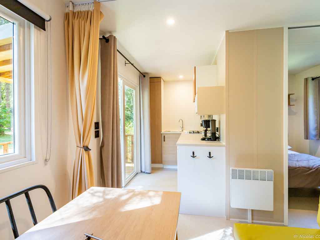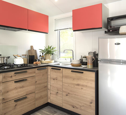 Ce mobil-home avec terrasse couverte possède 2 chambres séparées et une cuisine aménagée.